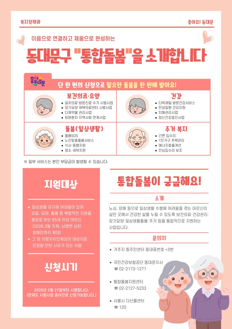 -돌봄: 돌봄SOS, 노인맞춤돌봄서비스, 식사·동행지원, 청소·세탁지원 등